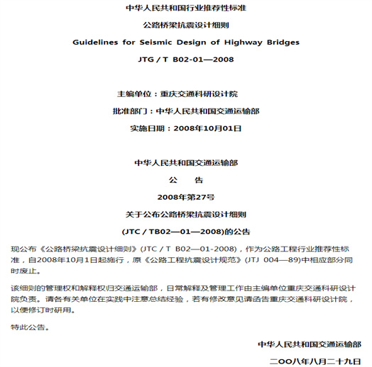 根據(jù)交通部《關(guān)于下達1999年度建設(shè)標(biāo)準(zhǔn)、規(guī)范、定額等編制、修訂工作計劃的通知》(交通部公路發(fā)[1999]82號),由重慶交通科研設(shè)計院組織對《公路工程抗震設(shè)計規(guī)范》 (JTJ 00489)橋梁抗震設(shè)計部分進行修訂,編寫《公路橋梁抗震設(shè)計細(xì)則》。