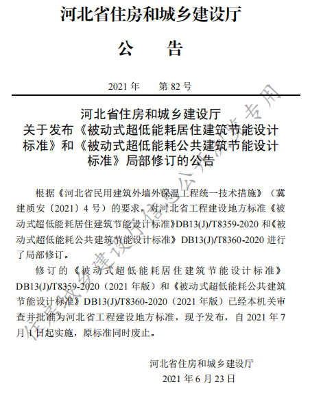 本標準修訂的主要技術內容是:1. 細化了圍護結構熱工性能要求;2. 增加了安全耐久相關內容,對不同保溫系統構造做法提出具體要求;3. 補充了熱橋處理、氣密性設計的相關內容;4. 更新并補充了設備、系統性能的具體要求。本標準由河北省建筑科學研究院有限公司負責解釋,由河北省建設工程標準編制研究中心負責管理。