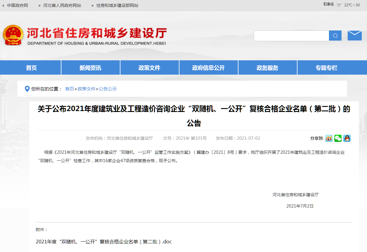 關于公布2021年度建筑業(yè)及工程造價咨詢企業(yè)“雙隨機、一公開”復核合格企業(yè)名單(第二批)的公告
